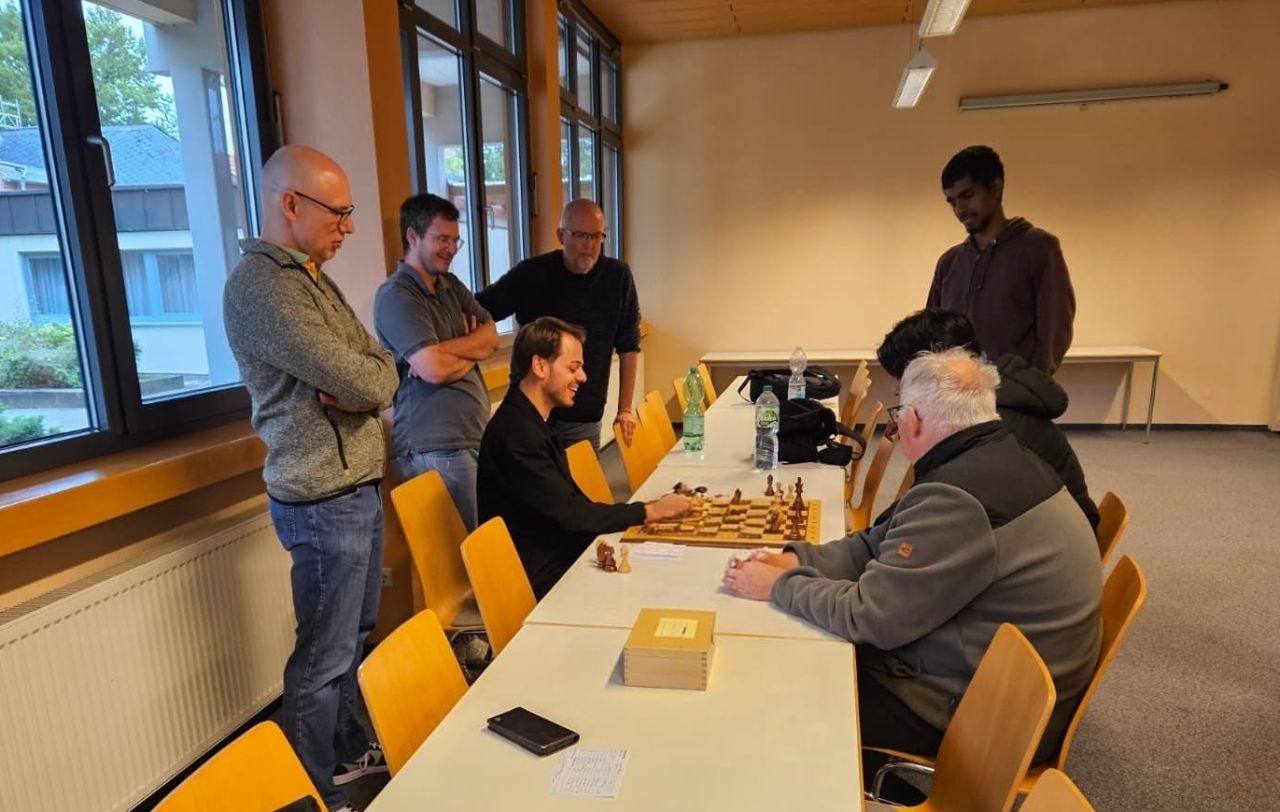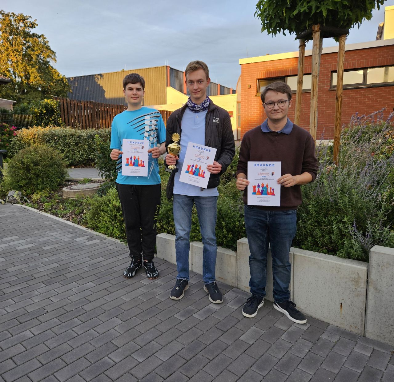 3. Platz beim Blitzschach M Am 22.08.2025 fand in Biblis die diesjährige Blitzschach-Mannschaftsmeisterschaft des Schachbezirkes 10 im Hessischen Schachverband statt. Es nahmen insgesamt neun Mannschaften aus sechs verschiedenen Vereinen des Bezirkes teil. Gespielt wurde mit Vierer-Teams nach dem Modus Jeder gegen Jeden und 3 Minuten + 2 Sekunden Bedenkzeit pro Spieler und Partie. ![]()